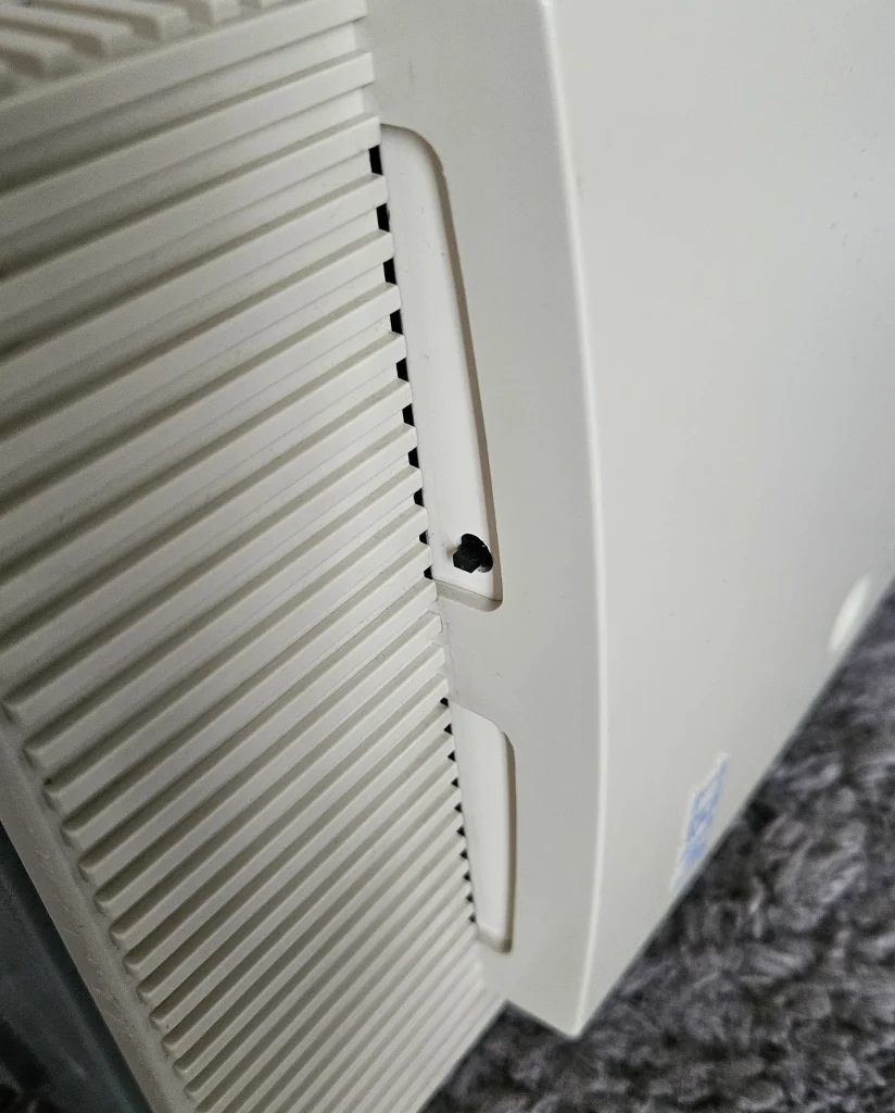 Következő a Reset gomb volt. Mivel az alaplapon adott volt a csatlakozás, egy kapcsolóra volt szükségem. Ezt a netem találtam is, szettben volt a HDD és a Power LED-el. Gondoltam, ha már ott vagyok, azokat is kicseréltem a házon, az eredetiek elég haloványak voltak már. A Reset gombnak pedig egy remek helyet találtam úgy, hogy nem kellett a házon se fúrni és az esztétikáját sem rontottam el vele. Alúl volt két hosszúkás nyílás, ami szellőzésre szolgál. Találtam itthon egy darab műanyagot (fogalmam sincs, mi volt valaha, de nekem pont megfelelt), olyan 1,5cm x 20cm, beszabtam, lukat fúrtam a mikrokapcsolónak, ragasztottam, és kész is. 🙂