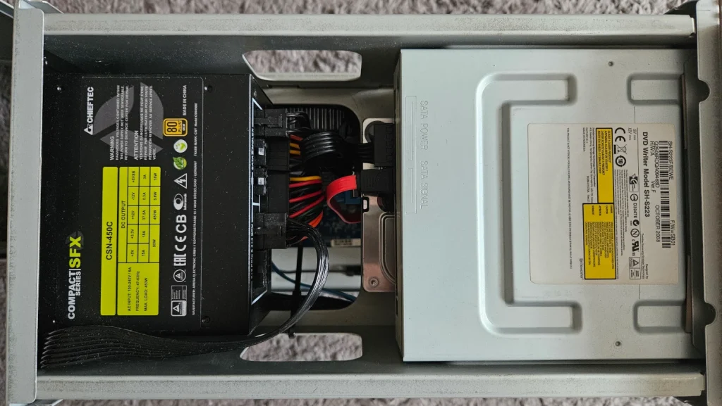 Működik? Ahhoz, hogy minden elférjen a házban, muszáj volt egy SFF tápegységet beszereznem, mert mint ahogy fent írtam, egyszerűen nincs annyi hely a házban. A célra a Chieftec Compact CSN-450C 450W-os tápegységet szemeltem ki, ez pont annyira pici, hogy elfért a táp és így előtte a DVD olvasó, ami szerencsére már valószínüleg a modern kor vívmánya, mert ez is rövidebb, mint amilyenek általában szoktak lenni, így elősegítette, hogy elférjen kényelmesen a házban.