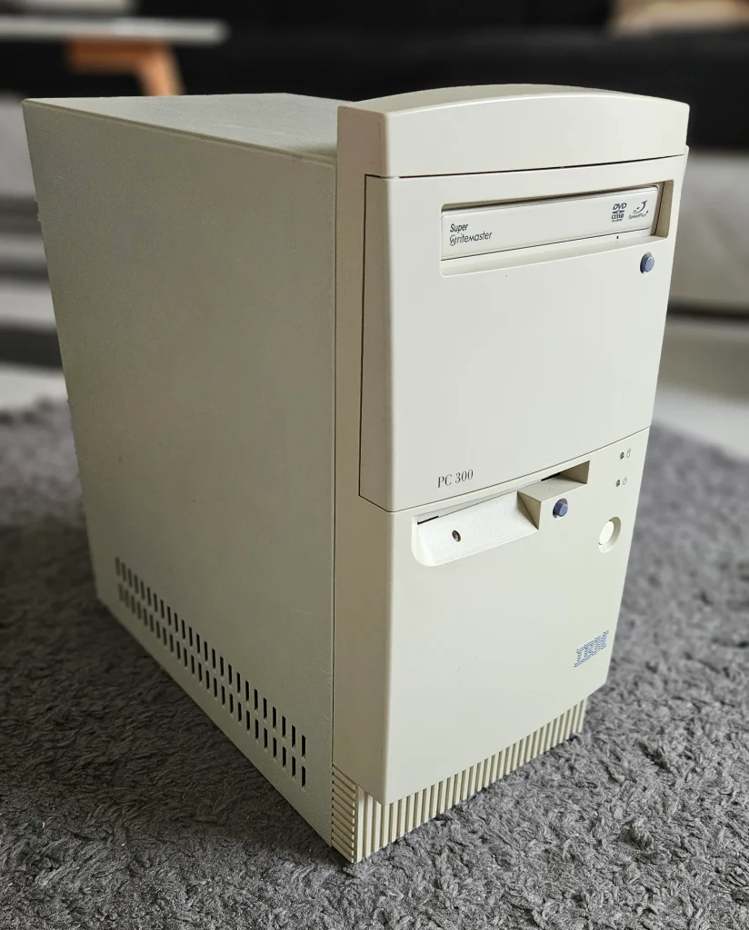 Mibe tegyem? Mivel az alaplap microATX, és amúgy is felesleges lenne egy nagy MIDI torony neki, ezért valami picikére gondoltam. Eszembe jutott, hogy nekem van egy házam, amit még kompletten vettem valamikor jó régen. A benne lévő dolgok működésképtelenek voltak, azokat már rég kukáztam, így csak a ház maradt meg, majd-jó-lesz-valamire. Ez egy IBM PC300 ház, microATX alaplap fér bele, kisebb megkötésekkel. Ezek közül az egyik, ha a DVD olvasót szeretném használni, akkor nem tehetek bele normál méretű tápegységet, mivel az egész ház pont annyival rövidebb, hogy a kettő nem fér el egymás mellett. A másik meg az, hogy nincs rajta pl. Reset gomb. Ezt azonban megoldottam, majd mindjárt kitérek rá. 🙂