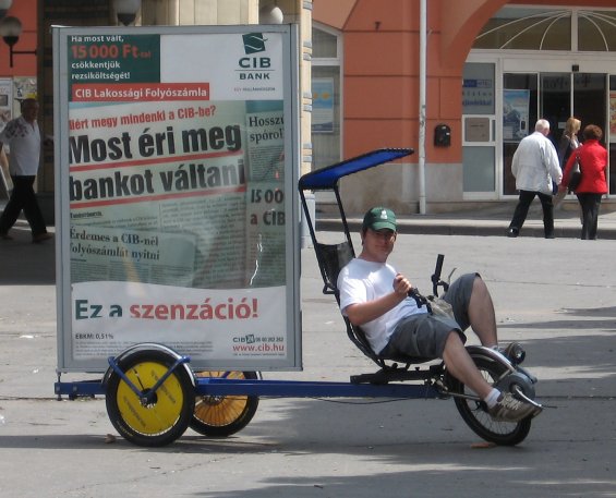 hol is voltam az elmúlt két hétben… úgy adódott, hogy egy diákszövetkezeten munkát ajánlottak. egy biciklis meló volt, reklámtáblás biciklivel kellett fel-alá tekergetnem a városban. 🙂 háromkerekű, kényelmes ülő résszel, kis napellenzővel a napfény ellen, és hátúl a nagy kétoldalú reklámtábla. nem a legprofibb és legjobb szerkezet, és hibája is volt már, de élvezetes volt vele menni, amit amúgy sem kellett túlzásba vinni, mivel nem kellett gyorsan mennem, volt hogy a gyalogosok is megelőztek.